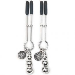 The Pinch Nipple Clams från den officiella serien Fifty Shades of Grey sexleksaker är ett par vackra bröstklämmor i metall till dig som både vill ha njutning och smärta. Klämmorna är justerbara så du kan få precis det tryck du önskar - därmed är The Pinch Nipple Clamps bra oavsett om du är ny eller erfaren på det där med bröstklämmor.