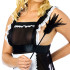 Den löst sittande kostymen gör inte mycket för att dölja din magnifika kropp. Den vita spetskanten kontrasterar fint mot allt det svarta, medan sidenbandet markerar din midja. Blir det lite kladdigt, tar den vita fyrkanten på förklädet hand om det.
