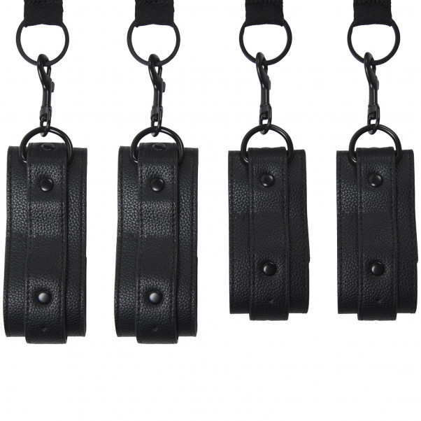 Lägg setet under madrassen och låt de rejäla manschetterna av konstläder sticka ut, en i varje hörn. Fäst dem runt din partners handleder och vrister, antingen med ansiktet uppåt eller nedåt beroende på vad ni föredrar.