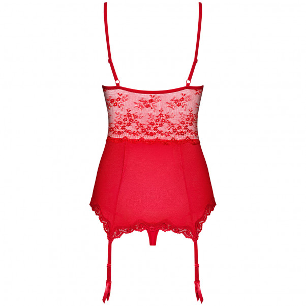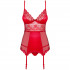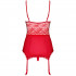 Setet innehåller en chemise producerad i en röd, mjuk och lätt transparent kvalitet, som ger en diskret genomsikt. Den röda spetsen pryder BH-kuporna och under bysten, samt löper längs nederkanten, vilket ramar in och framhäver din rumpa.