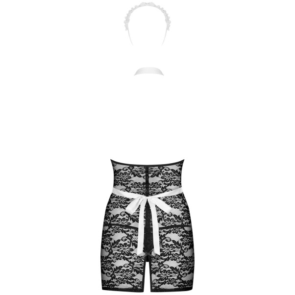 Den tighta klänningen har en haltertopp som knyts upp med ett vitt band, med små öppningar mellan knappar som leder ner till din förklädesdefinierade midja. Ditt hår kommer att hållas borta från ansiktet med spetsdiademet för att se till att du kan utföra alla uppgifter utan krångel.
