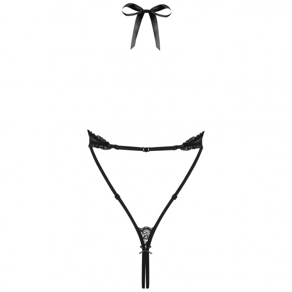 Den främre öppningen är prydd med spetsram och leder ögat från din barm hela vägen ner till ditt saftiga center, vilket gör att det genomskinliga meshmaterialet nästan verkar blygsamt. Snörningsdetaljen under dina bröst och bakom halsen kommer att få din partner att desperat knyta upp dig som en present.