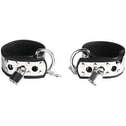 Njut av de snygga manschetterna och känslan av att vara helt fastspänd tack vare metallplattan på utsidan. Låt hänglåsen tillföra en extra fräck dimension för er båda.