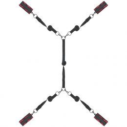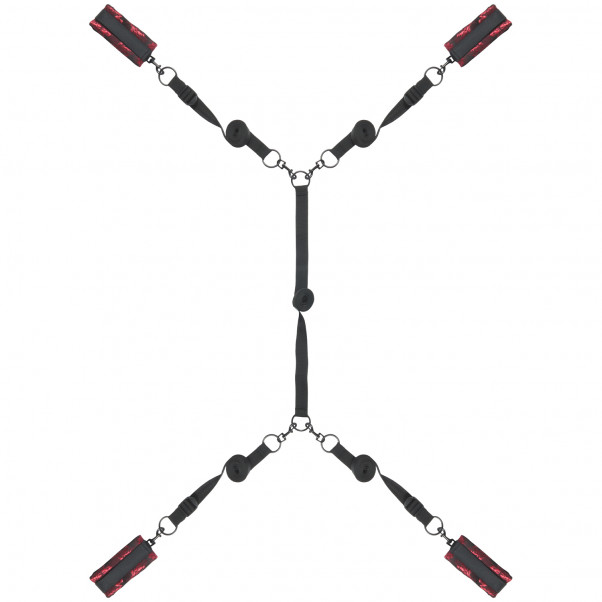 Manschetterna spänns fast till en stropp som igen sätts fast till en tvärgående stropp som sitter dold under sängen (se bild nr 3, till vänster för denna beskrivning). Därefter kan du lätt fästa händerna och benen till sängen. Manschetterna är avtagbara och kan därför också användas för sig själv.