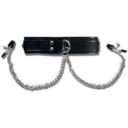 Halsbandet ger inte bara ett pikant utseende. De justerbara bröstklämmorna är också ett perfekt redskap, när det ska delas ut njutbar belöning eller smärtsam bestraffning.