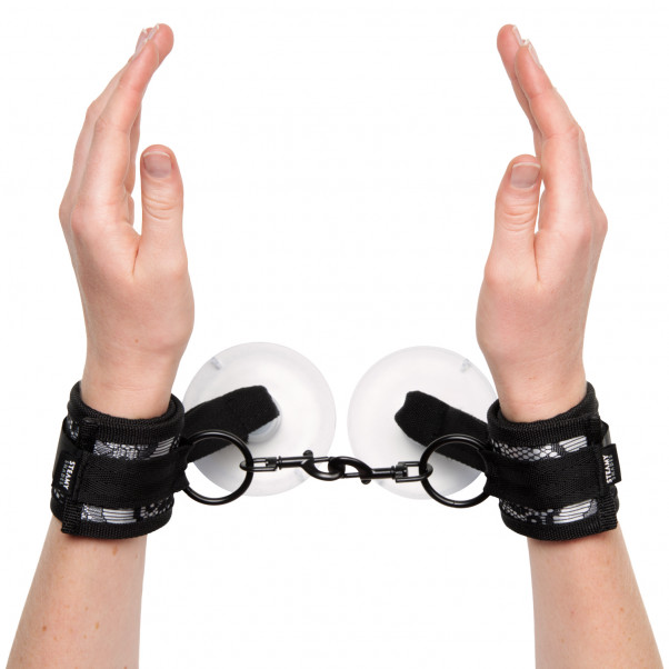 Sugkopparna fäster säkert på alla släta ytor, vilket gör dem perfekta för lätt bondage-lek i badrummet. Med din partner placerad mot väggen, helt överlämnande för otyglade nöjen, låter dessa manschetter dig utforska spännande nya positioner och möjligheter.
