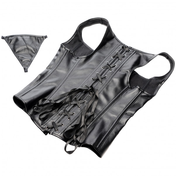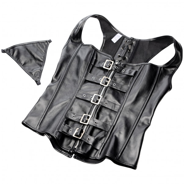 Denna iögonfallande korsett med matchande stringtrosa ger dig en nattsvart läderlook och tack vare dragkedjan framtill och de 5 spännena kommer du att få till en perfekt tajt och strikt passform.
