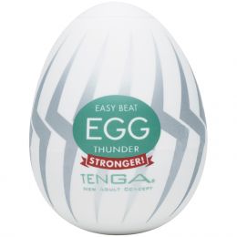 Tenga Egg Thunder är en flexibel onaniprodukt för män, med en "blixtrande" skön inre struktur full av räfflor och klyftor. Thunder är en del av STRONGER serien, där materialet är lite tjockare och ger en fastare känsla.