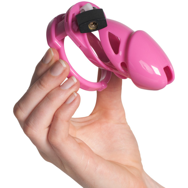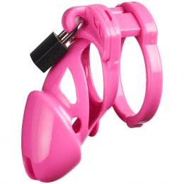 Den rosaaktiga kyskhetsanordningen består av en penisbur (välj mellan 3 storlekar), 4 basringar i olika storlekar, 4 spacers och låsstift, 3 anti-pullouts med texturerade sidor, 1 låsstiftlock och ett hänglås med 2 nycklar. Det kan också monteras utan utdragningsskydd för att göra det mer nybörjarvänligt, och utdragningsskyddet kan fästas på senare för att göra buren ännu säkrare.